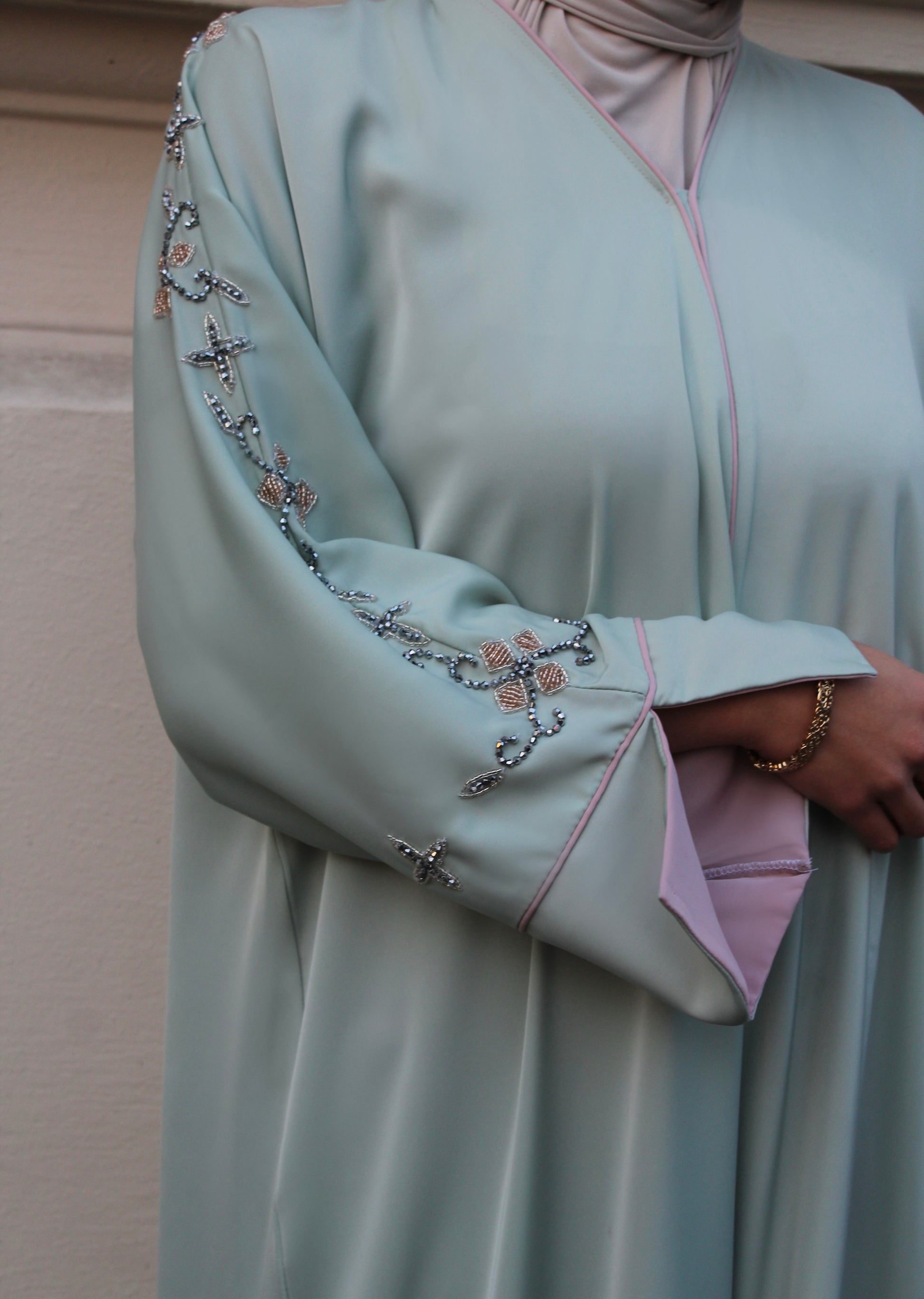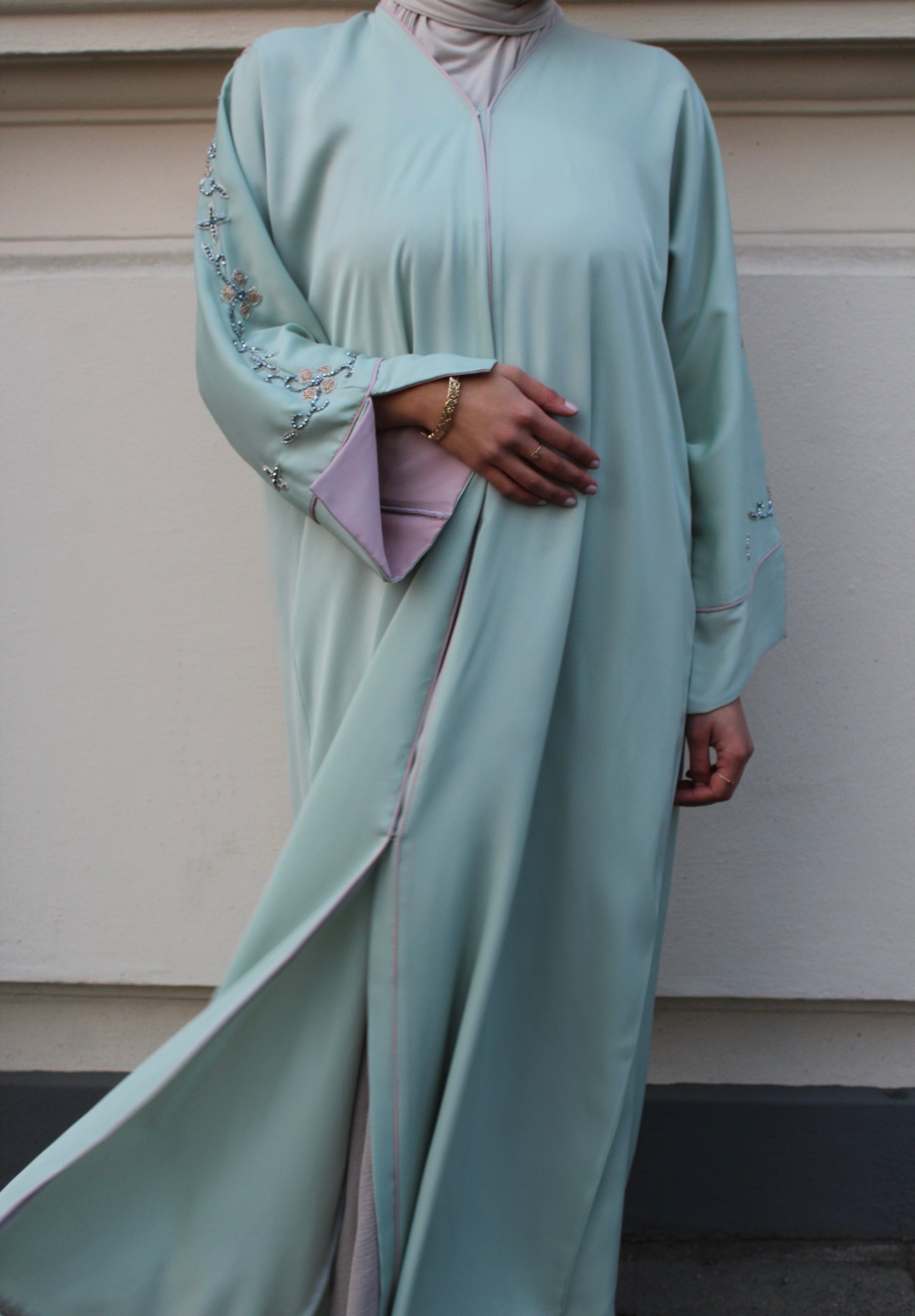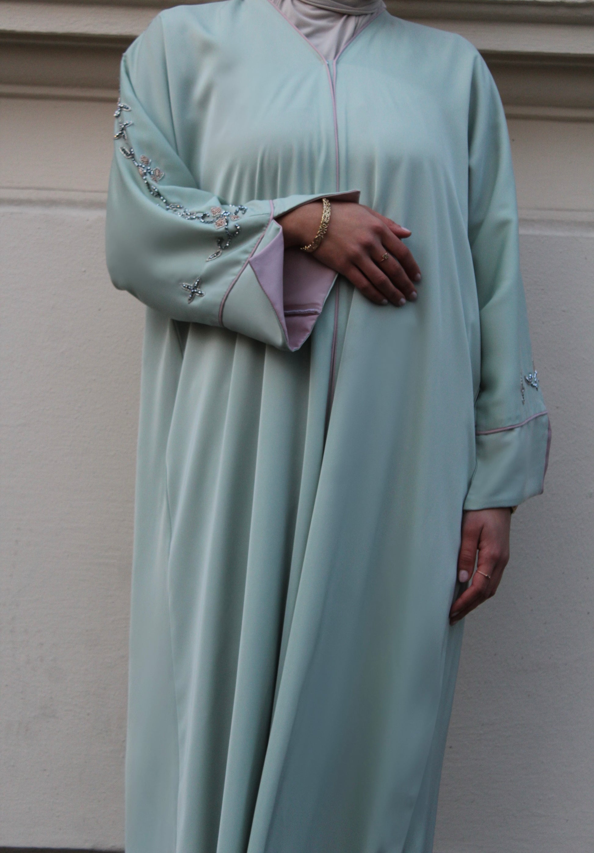 Unsere Abaya ,Hope' besticht durch ihren raffinierten Schnitt und den farblichen Kontrast zwischen dem türkisen Außenstoff und dem rosafarbenen Innenfutter. Die Ärmel werden durch edle funkelnde Glitzersteine veredelt und verleihen der Abaya eine luxuriöse Note. Die sorgfältige Verarbeitung sorgt für eine ansprechende Optik, während die Materialien Komfort und Bewegungsfreiheit bieten.